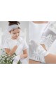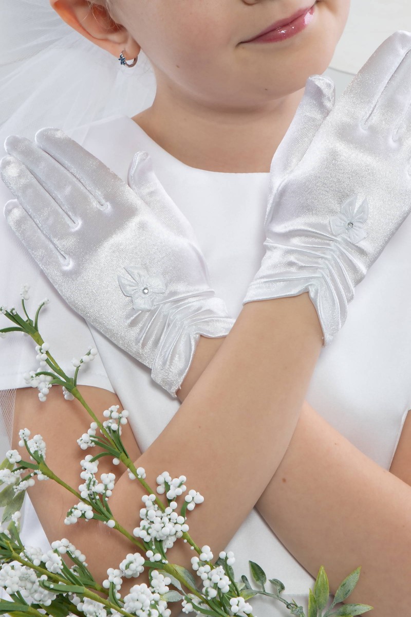 Artykuł z naszej oferty na fotografii należy do kategorii: Akcesoria - Dodatki komunijne dla dziewczynek. Modelka prezentuje rękawiczki komunijne należące do serii: Rękawiczki komunijne klasyczne.