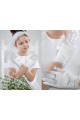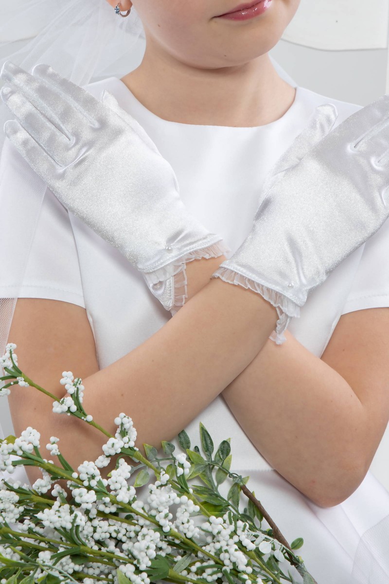 Artykuł z naszej oferty na fotografii należy do kategorii: Akcesoria - Dodatki komunijne dla dziewczynek. Modelka prezentuje rękawiczki komunijne należące do serii: Rękawiczki komunijne klasyczne.