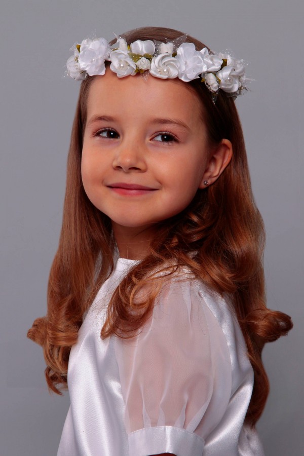 Artykuł z naszej oferty na fotografii należy do kategorii: Akcesoria - Dodatki komunijne dla dziewczynek. Modelka prezentuje rękawiczki komunijne należące do serii: Rękawiczki komunijne na palec.