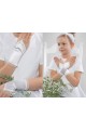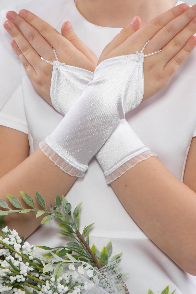 Artykuł z naszej oferty na fotografii należy do kategorii: Akcesoria - Dodatki komunijne dla dziewczynek. Modelka prezentuje rękawiczki komunijne należące do serii: Rękawiczki komunijne na palec.