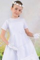 Strój na fotografii należy do kategorii: Ubiory komunijne dla dziewczynek. Modelka prezentuje sukienkę z serii: Sukienki komunijne klasyczne.