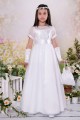 Strój na fotografii należy do kategorii: Ubiory komunijne dla dziewczynek. Modelka prezentuje sukienkę z serii: Sukienki komunijne klasyczne.