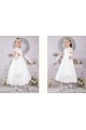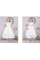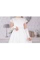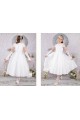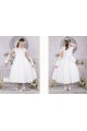 Elegancka sukienka komunijna „balerinka” półdługa uszyta z satyny i haftowanego tiulu z gipiurą.