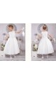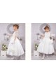 Elegancka sukienka komunijna „balerinka” półdługa uszyta z satyny i haftowanego tiulu z gipiurą.