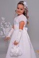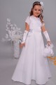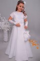 Strój na fotografii należy do kategorii: Ubiory komunijne dla dziewczynek. Modelka prezentuje sukienkę z serii: Sukienki komunijne satynowe.