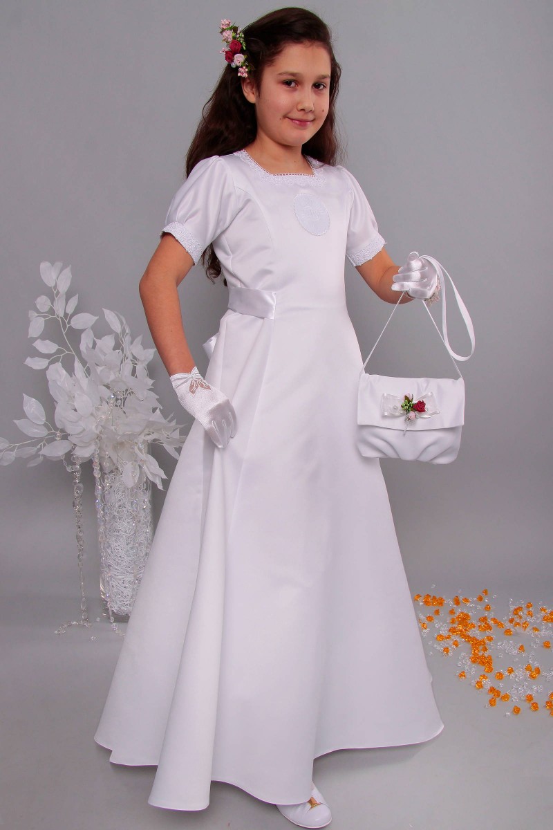 Strój na fotografii należy do kategorii: Ubiory komunijne dla dziewczynek. Modelka prezentuje sukienkę z serii: Sukienki komunijne satynowe.