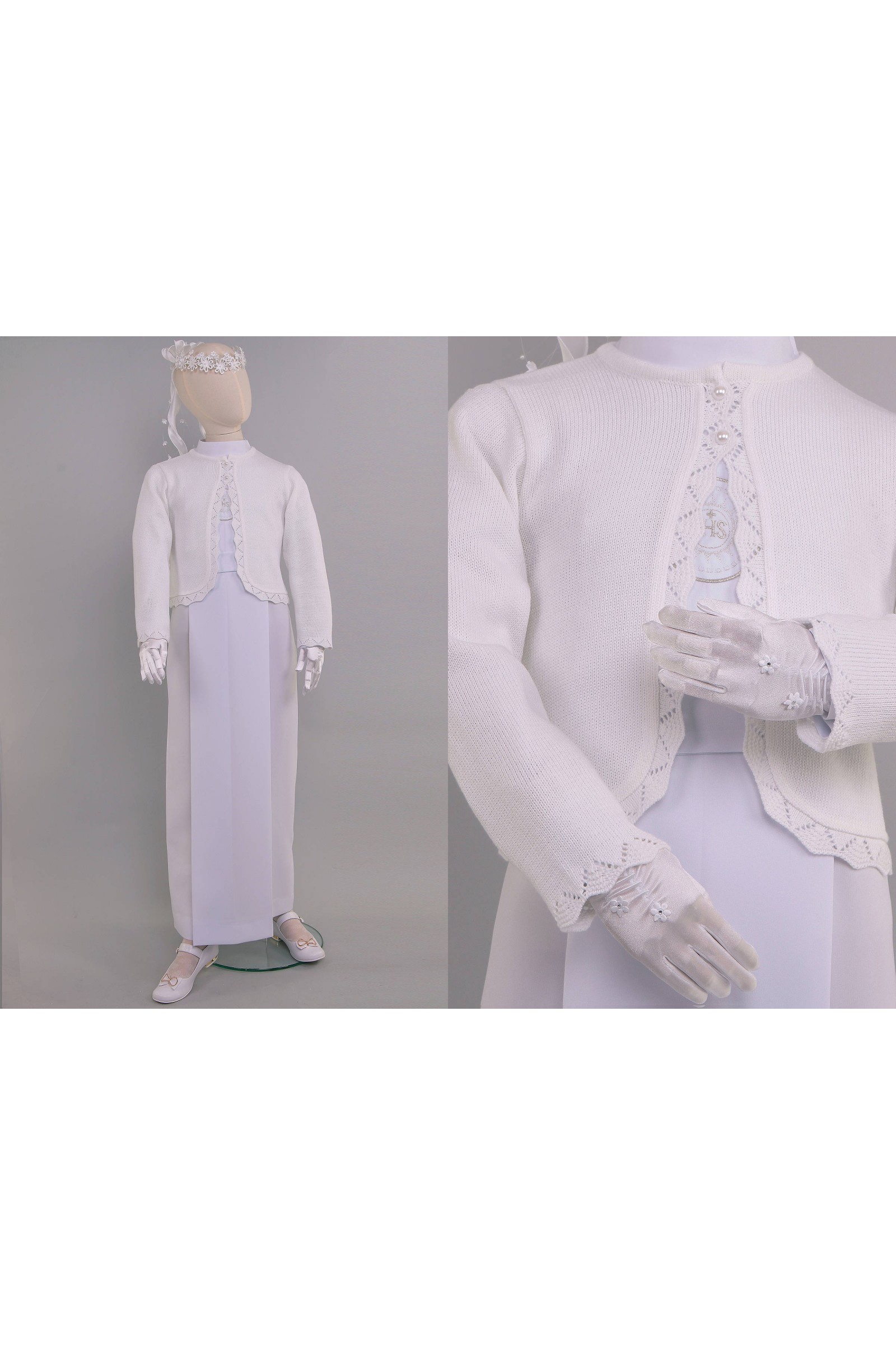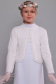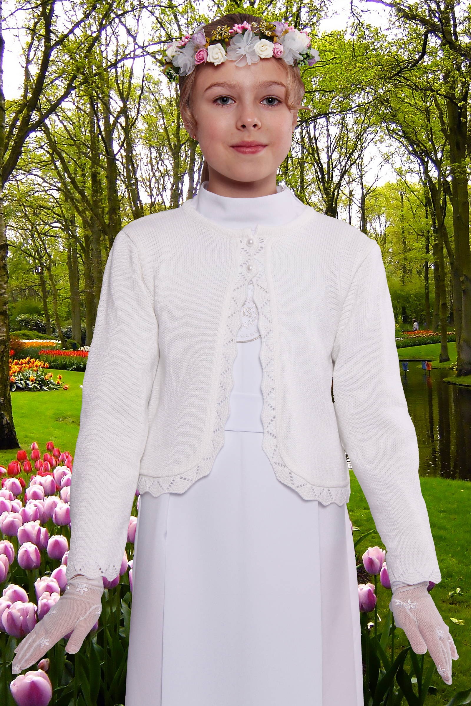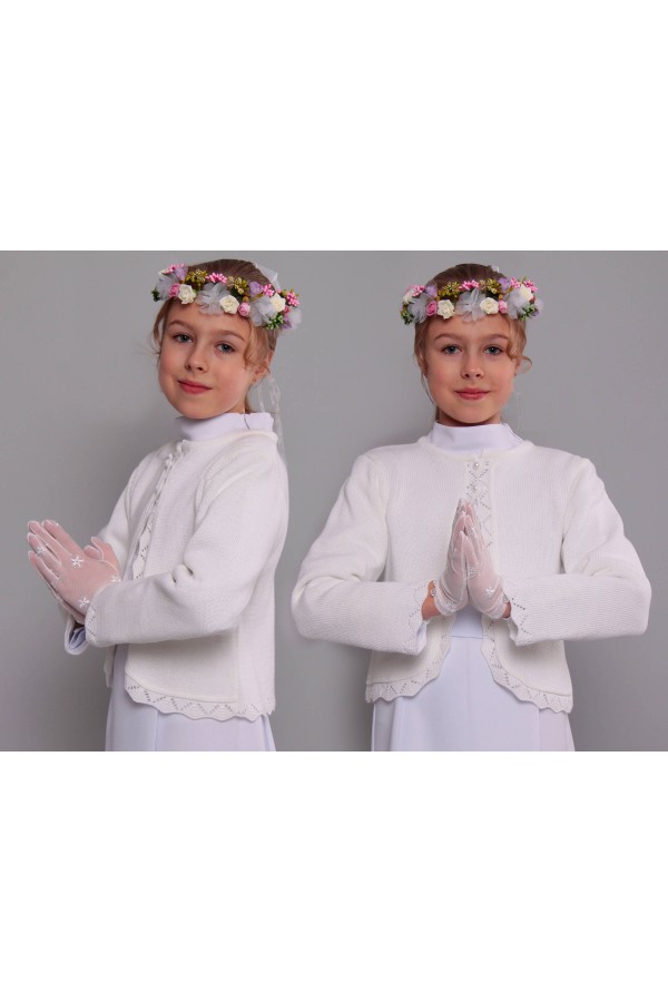Każda mama dziewczynki przygotowującej się do Pierwszej Komunii martwi się jak zabezpieczyć swoją córeczkę przed zimnem w kościele. Zdejmujemy tę troskę, ponieważ mamy doskonałą propozycję na tą ewentualność. Proponujemy ładne, doskonałej jakości sweterki komunijne zaprojektowane specjalnie do założenia na albę lub sukienkę komunijną. Modelka prezentuje dodatek komunijny z kolekcji: Sweterki komunijne.