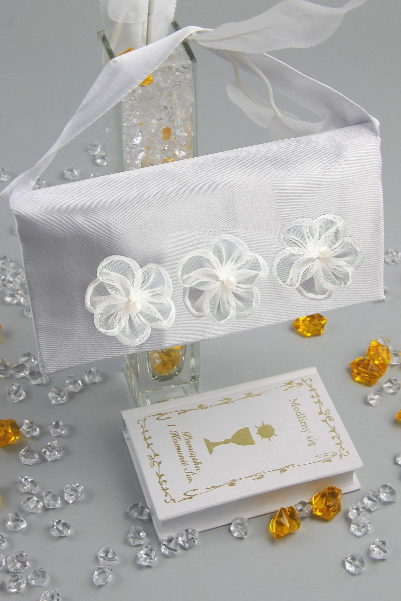 Dodatki komunijne dla dziewczynki to również torebki. Produkt z naszej oferty należy do kategorii: Akcesoria przeznaczone na pierwszą komunię dla dziewczynek. Zdjęcie prezentuje torebkę należącą do serii: Torebki komunijne kopertowe.