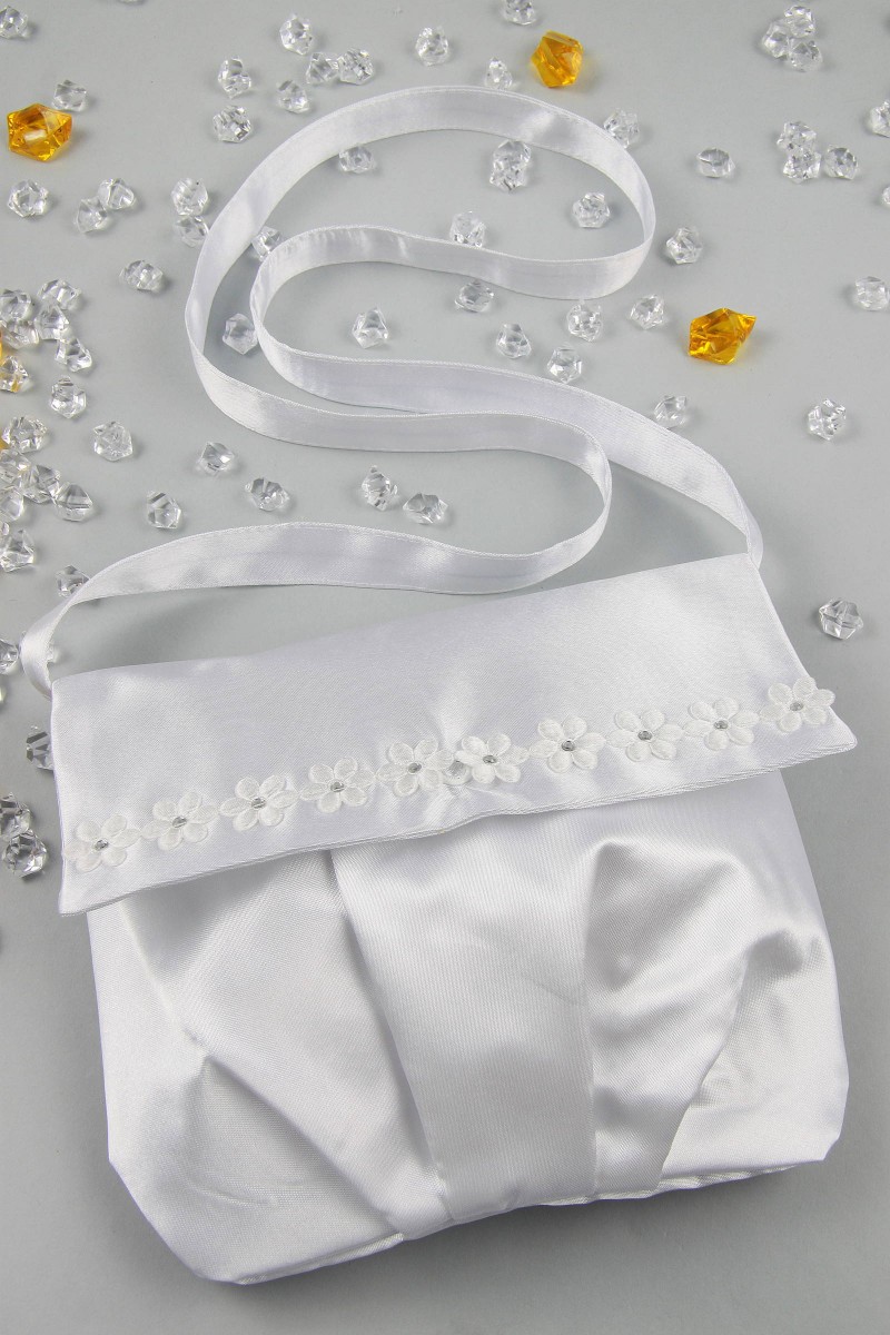 Dodatki komunijne dla dziewczynki to również torebki. Produkt z naszej oferty należy do kategorii: Akcesoria przeznaczone na pierwszą komunię dla dziewczynek. Zdjęcie prezentuje torebkę należącą do serii: Torebki komunijne na pasek.