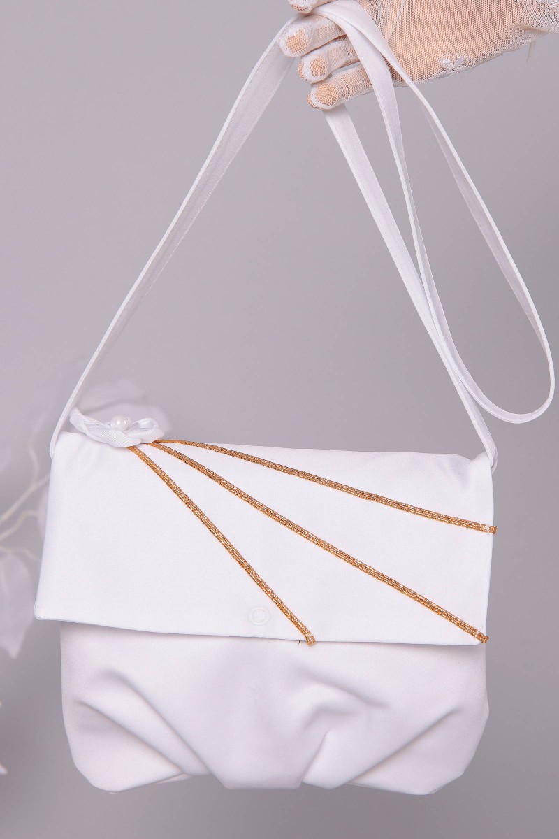Dodatki komunijne dla dziewczynki to również torebki. Produkt z naszej oferty należy do kategorii: Akcesoria przeznaczone na pierwszą komunię dla dziewczynek. Zdjęcie prezentuje torebkę należącą do serii: Torebki komunijne satynowe na pasek.