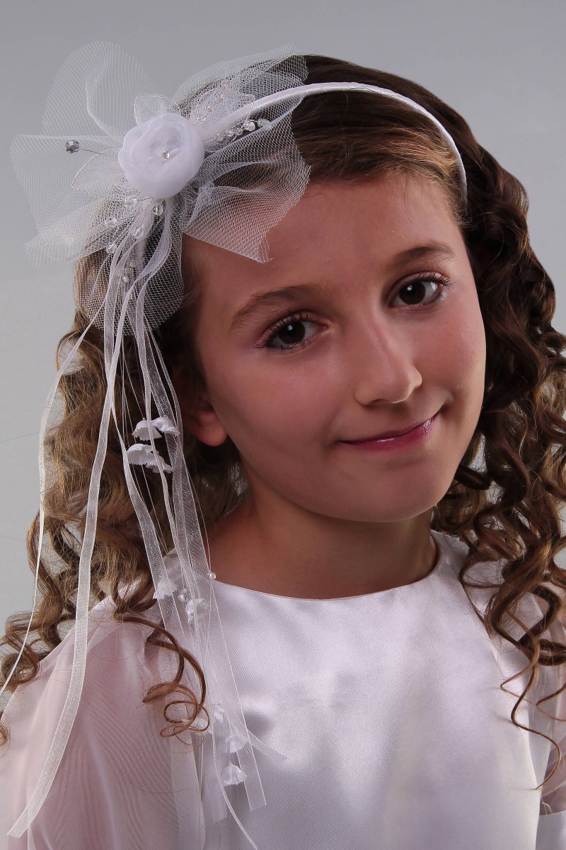 Wzór na fotografii należy do kategorii: Dodatki komunijne dla dziewczynek. Modelka prezentuje opaskę komunijną należącą do serii: Opaski komunijne.