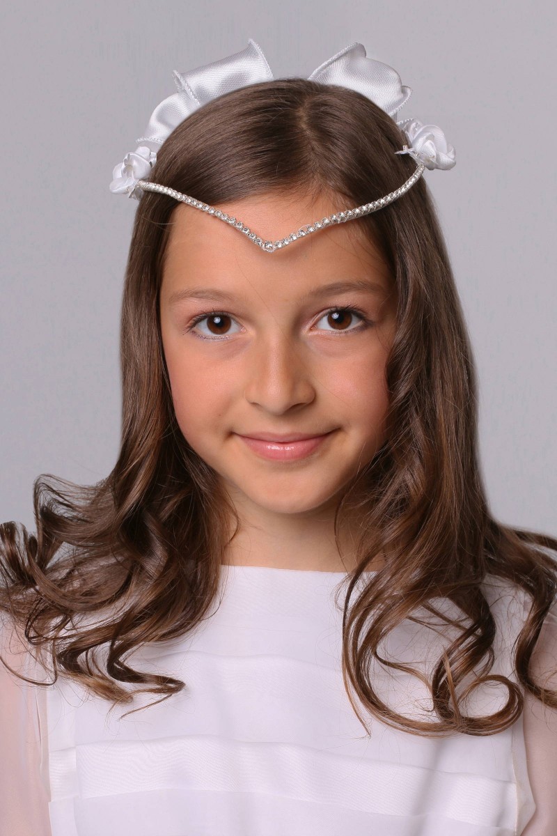 Wzór na fotografii należy do kategorii: Dodatki komunijne dla dziewczynek. Modelka prezentuje półwianek komunijny należący do serii: Półwianki.