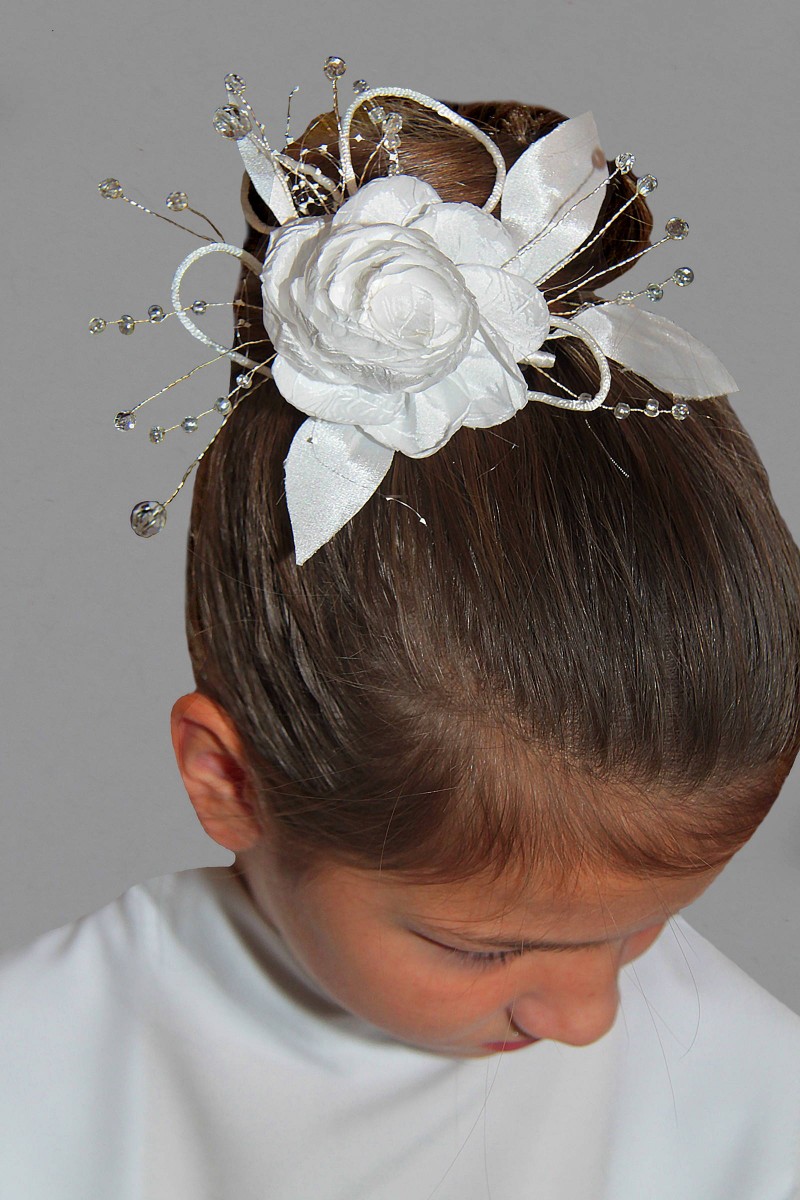Wzór na fotografii należy do kategorii: Dodatki komunijne dla dziewczynek. Modelka prezentuje przypinkę komunijną należącą do serii: Przypinki komunijne do włosów.