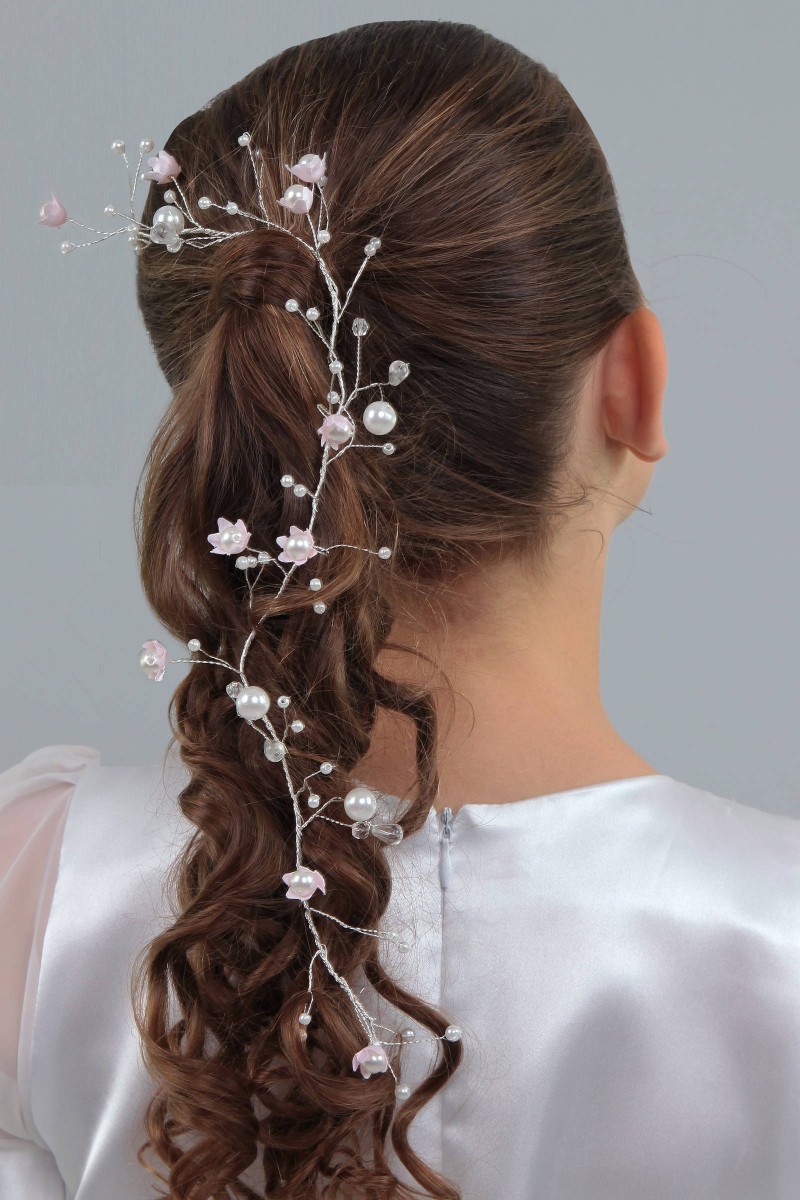 Wzór na fotografii należy do kategorii: Dodatki komunijne dla dziewczynek. Modelka prezentuje przypinkę komunijną należącą do serii: Przypinki komunijne do włosów.