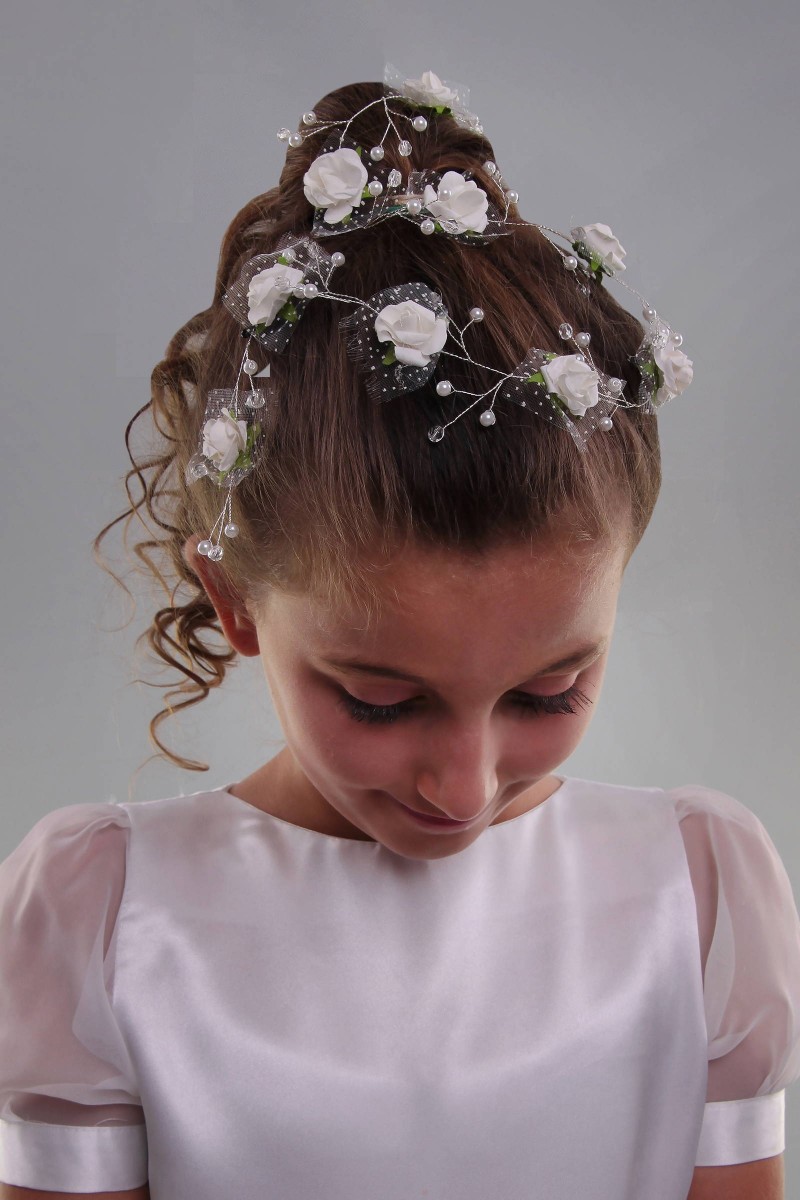 Wzór na fotografii należy do kategorii: Dodatki komunijne dla dziewczynek. Modelka prezentuje przypinkę komunijną należącą do serii: Przypinki komunijne do włosów.