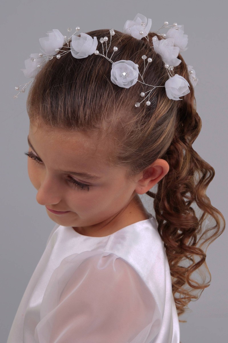 Wzór na fotografii należy do kategorii: Dodatki komunijne dla dziewczynek. Modelka prezentuje przypinkę komunijną należącą do serii: Przypinki komunijne do włosów.