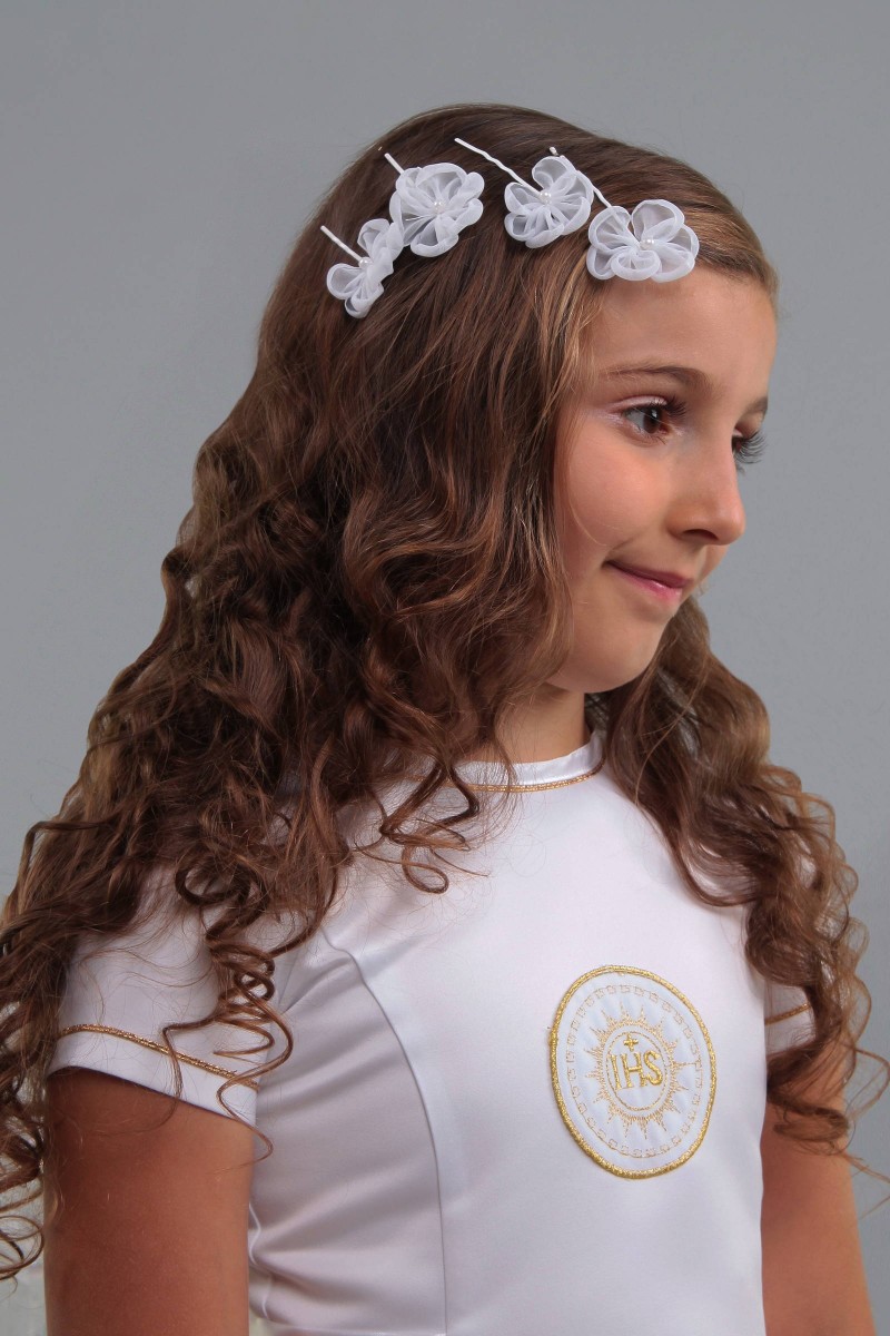 Wzór na fotografii należy do kategorii: Dodatki komunijne dla dziewczynek. Modelka prezentuje spinkę komunijną należącą do serii: Spinki komunijne do włosów.