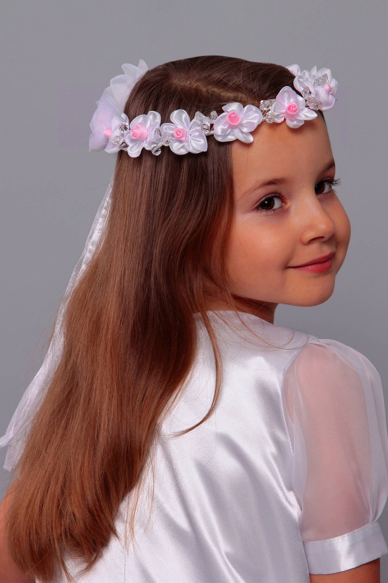 Wzór na fotografii należy do kategorii: Dodatki komunijne dla dziewczynek. Modelka prezentuje wianek komunijny należący do serii: Wianki komunijne New Style.
