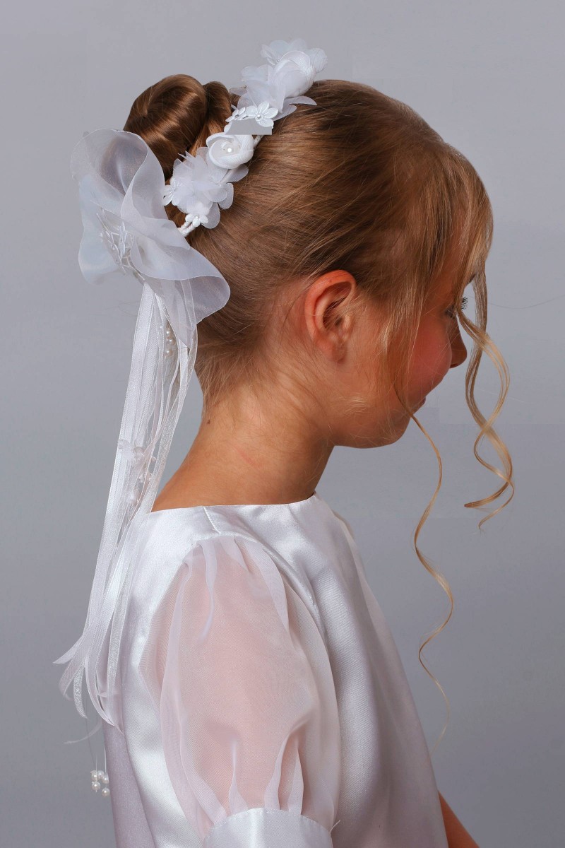 Wzór na fotografii należy do kategorii: Dodatki komunijne dla dziewczynek. Modelka prezentuje wianek komunijny należący do serii: Wianki komunijne na koczek.