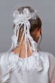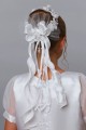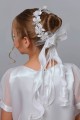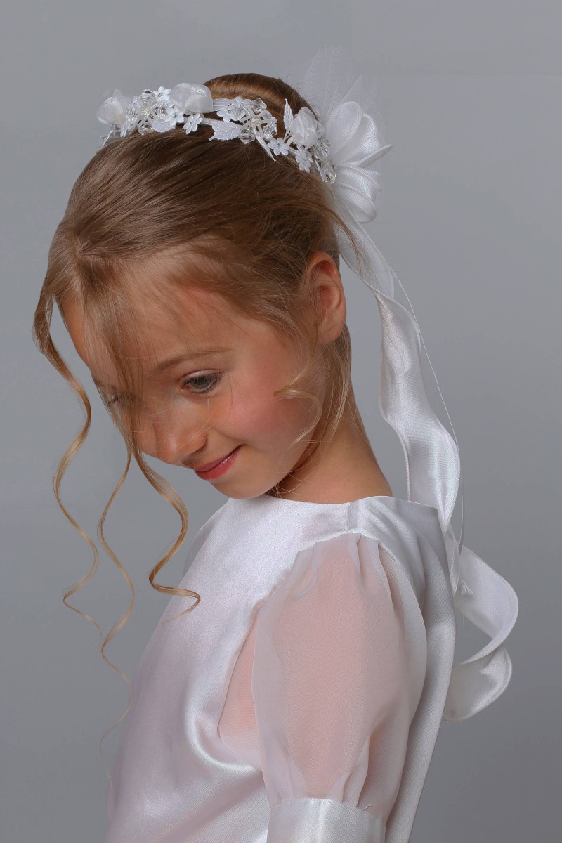 Wzór na fotografii należy do kategorii: Dodatki komunijne dla dziewczynek. Modelka prezentuje wianek komunijny należący do serii: Wianki komunijne na koczek.
