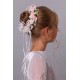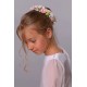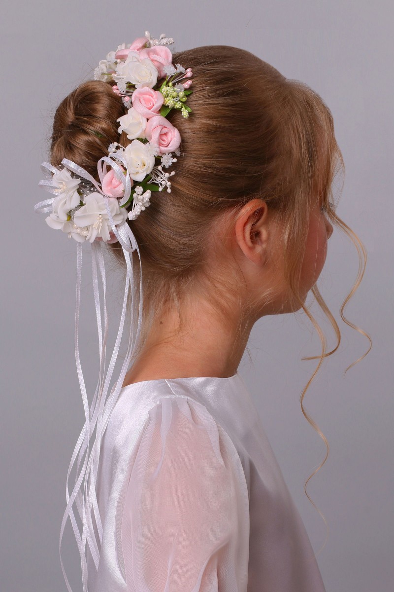 Wzór na fotografii należy do kategorii: Dodatki komunijne dla dziewczynek. Modelka prezentuje wianek komunijny należący do serii: Wianki komunijne "Jak żywe" na koczek.