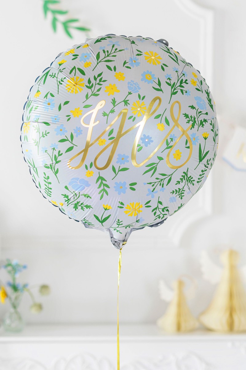 Balon komunijny Łączka ze złotym napisem IHS ozdobiony nadrukiem kwiatowym z motywem łączki wykonany z folii. Duży i bardzo wytrzymały!