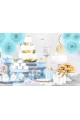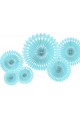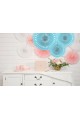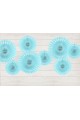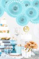 Elegancka, bardzo ładna dekoracja komunijna składająca się z kompletu 3 sztuk Błękitnych ROZET przeznaczona do sali, pokoju lub ogrodu. Artykuł z papieru w kształcie koła rozkładającego się jak wachlarz w błękitnym kolorze.
