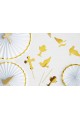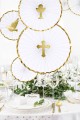 Niezwykle elegancko podkreśli urodę pomieszczenia, ale też dzięki niej możemy zaznaczyć wyraźnie stylistykę ze złotymi akcentami. Polecamy dołączyć do niej inne złote elementy i wykorzystać jako przepiękne koło, które umieszczone wysoko udekoruje stół. Dodatkową atrakcją z pewnością będzie naklejenie na złotych symbolach imienia dziecka (przykład prezentujemy na ostatniej fotografii), dla którego przyjęcie z okazji Pierwszej Komunii jest niezapomnianym przeżyciem.