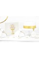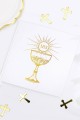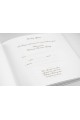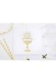 Księga Gości Komunijnych oprawiona perłowym papierem w kolorze białym, ze złotym kielichem. Posiada dwie pierwsze strony nadrukowane (do wpisania danych i wklejenia zdjęcia). Pięknie prezentuje się na białym obrusie, który podkreśli jej złote zdobienie. Elegancka, biała wspaniale skomponuje się z piękną dekoracją stanowiąc harmonijną całość. Przykłady aranżacji pokazują fotografie.