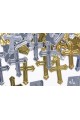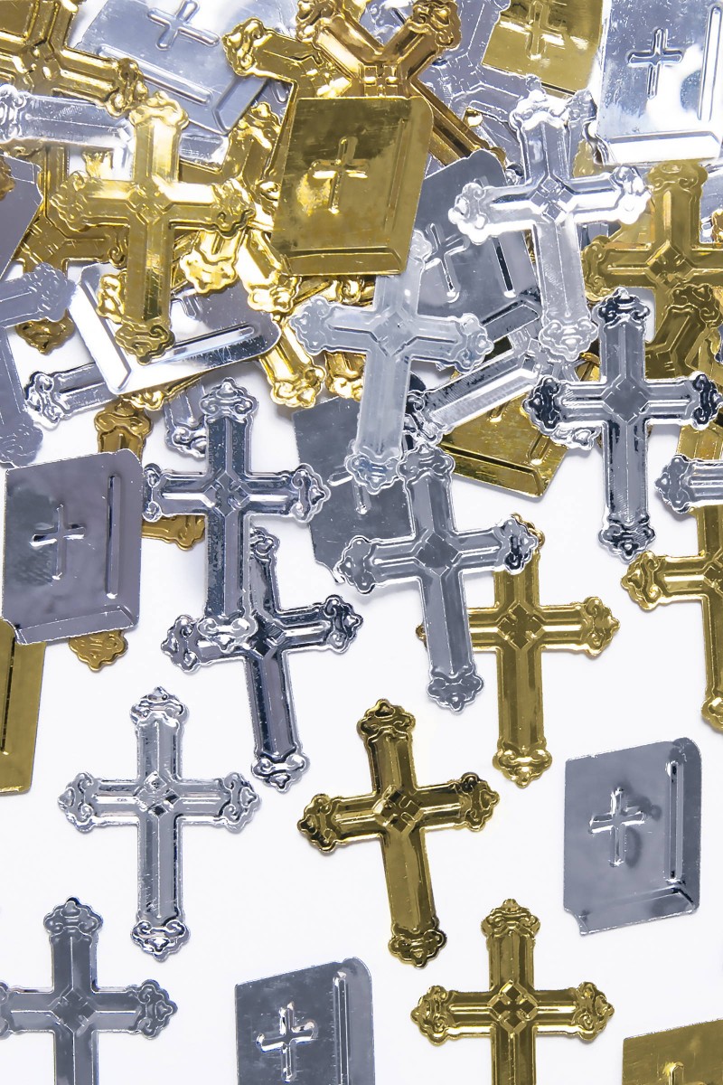 Confetti - Złote i Srebrne w dwóch kształtach – krzyżyka i księgi. Będą doskonałym dodatkiem do dekoracji jakimi są Komunijne Zestawy graficzne m.in zaproszenia, plakaty, które zawierają motyw liturgiczny z krzyżykiem a znajdują się w kategorii: ZESTAWY DEKORACYJNE z ZAPROSZENIAMI i KSIĘGĄ GOŚCI.