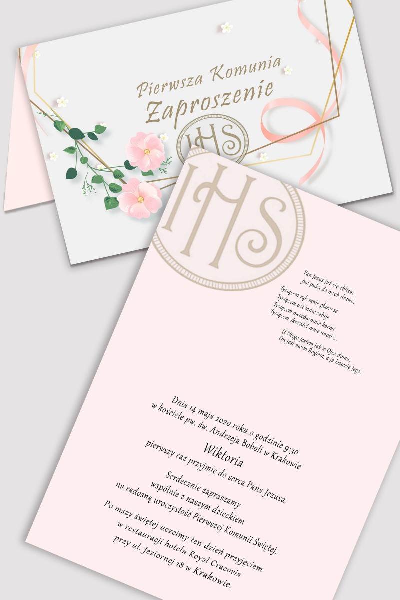 Personalizowane zaproszenia komunijne z zestawów - Różowa wstążeczka