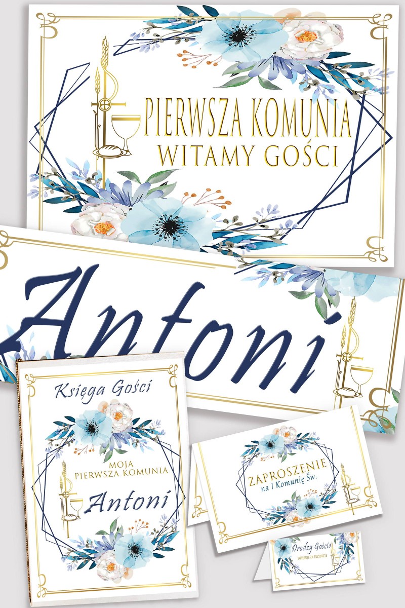 Personalizowany dekoracyjny zestaw komunijny - Błękitna akwarelka