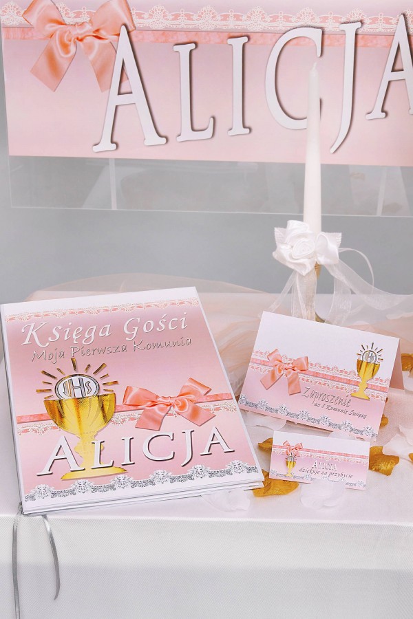 Pierwsza Komunia Święta, to uroczystość, którą pamiętamy całe życie. Oprócz samego przyjęcia, chcielibyśmy zapamiętać ludzi, którzy towarzyszyli nam w tak istotnych dla nas chwilach. Prezentujemy Państwu personalizowane księgi pamiątkowe, zawierające 11 stron, w których można umieszczać zdjęcia, wpisy oraz życzenia od gości. Zostały zaprojektowane przez naszych grafików z ogromną precyzją i dbałością o każdy szczegół. Dostępny szeroki wybór motywów kwiatowych, roślinnych oraz minimalistycznych, które idealnie wpasują się w klimat przyjęcia. Personalizowana księga pamiątkowa będzie stanowiła piękną pamiątkę.