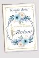 1 sztuka - Księga gości - format A4, personalizowany element, twarda okładka, wewnątrz 11 kart papieru kredowego A5 do pamiątkowych wpisów zaproszonych osób, na okładce grafika zawierająca imię dziecka. Wewnątrz jest pierwsza karta zawierająca piękne podziękowanie dla przybyłych gości.