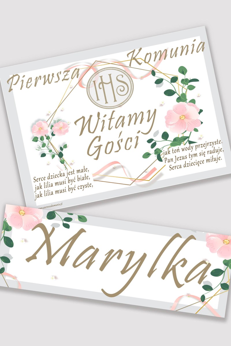 Personalizowany plakat komunijny z imieniem - Różowa wstążeczka