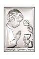 Srebrny obrazek z wizerunkiem chłopca - pamiątka wykonana metodą płaskorzeźby na srebrnym surowcu. Jest to idealny prezent upamiętniający sakrament Pierwszej Komunii Świętej. Produkt posiada elegancką formę, wykonany techniką plateru czyli artystyczny kształt blaszki pokrytej srebrem z wytłoczonym lub wygrawerowanym wzorem.