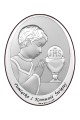 Srebrny obrazek z wizerunkiem chłopca - pamiątka wykonana metodą płaskorzeźby na srebrnym surowcu. Jest to idealny prezent upamiętniający sakrament Pierwszej Komunii Świętej. Produkt posiada elegancką formę, wykonany techniką plateru czyli artystyczny kształt blaszki pokrytej srebrem z wytłoczonym lub wygrawerowanym wzorem.