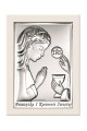 Srebrny obrazek z wizerunkiem dziewczynki - pamiątka wykonana metodą płaskorzeźby na srebrnym surowcu. Jest to idealny prezent upamiętniający sakrament Pierwszej Komunii Świętej. Produkt posiada elegancką formę, wykonany techniką plateru czyli artystyczny kształt blaszki pokrytej srebrem z wytłoczonym lub wygrawerowanym wzorem.