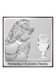 Srebrny obrazek z wizerunkiem dziewczynki - pamiątka wykonana metodą płaskorzeźby na srebrnym surowcu. Jest to idealny prezent upamiętniający sakrament Pierwszej Komunii Świętej. Produkt posiada elegancką formę, wykonany techniką plateru czyli artystyczny kształt blaszki pokrytej srebrem z wytłoczonym lub wygrawerowanym wzorem.