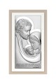 Obrazek Świętej Rodziny wykonany metodą płaskorzeźby na srebrnym surowcu. Jest to idealny prezent upamiętniający sakrament Pierwszej Komunii Świętej czy inne ważne duchowe wydarzenia. Produkt posiada elegancką formę, wykonany techniką plateru czyli artystyczny kształt blaszki pokrytej srebrem z wytłoczonym lub wygrawerowanym wzorem.