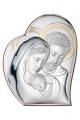 Obrazek Świętej Rodziny wykonany metodą płaskorzeźby na srebrnym surowcu. Jest to idealny prezent upamiętniający sakrament Pierwszej Komunii Świętej czy inne ważne duchowe wydarzenia. Produkt posiada elegancką formę, wykonany techniką plateru czyli artystyczny kształt blaszki pokrytej srebrem i złotem z wytłoczonym lub wygrawerowanym wzorem.