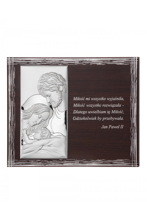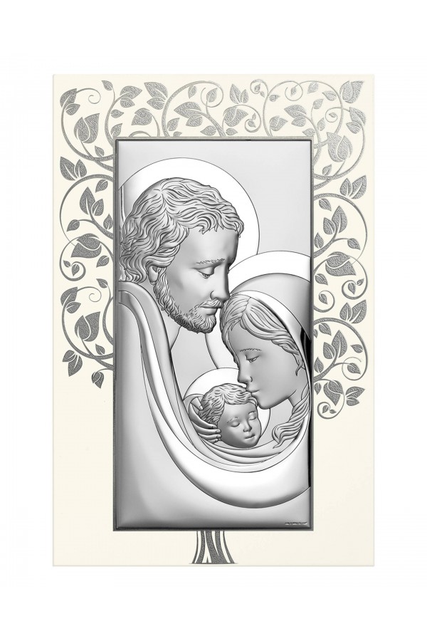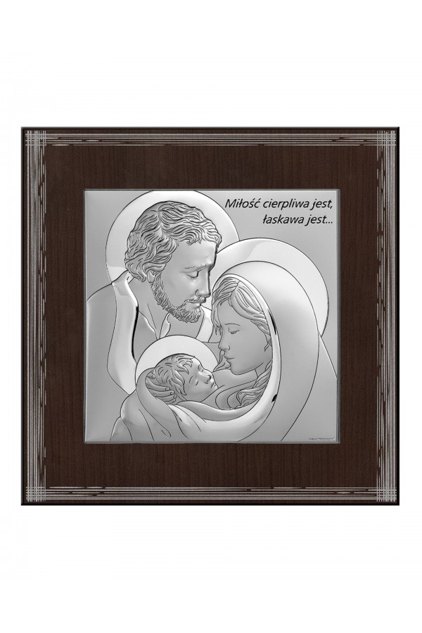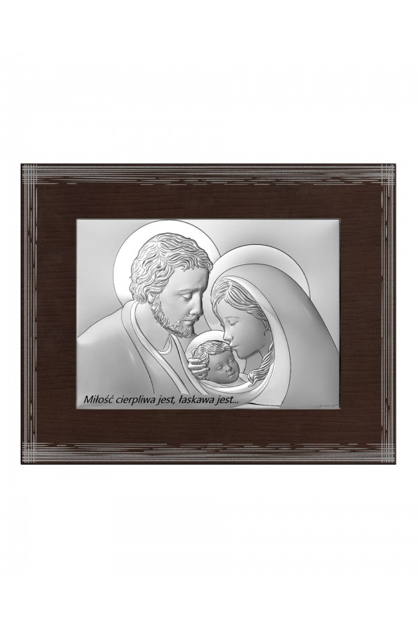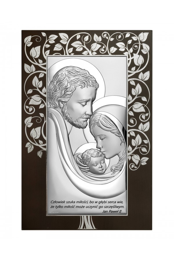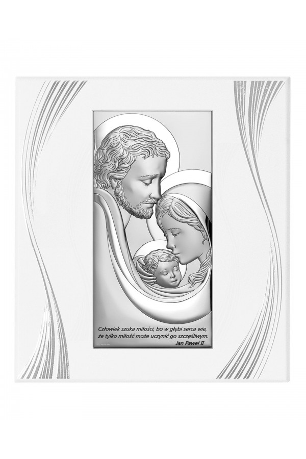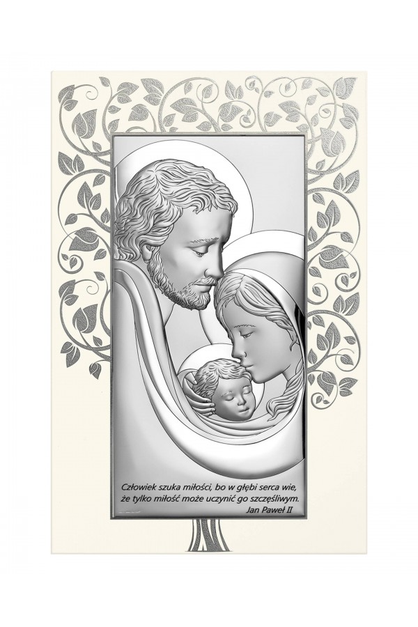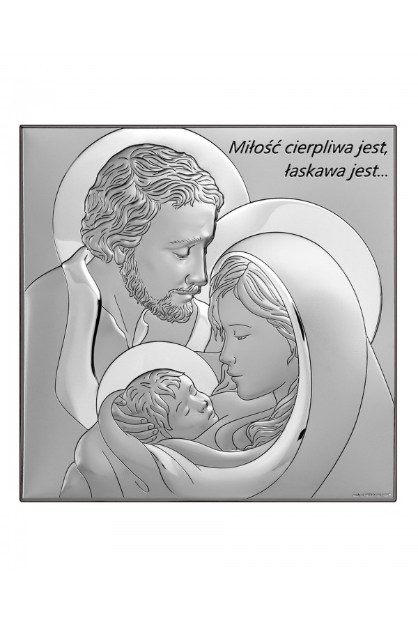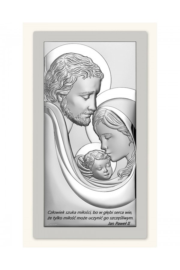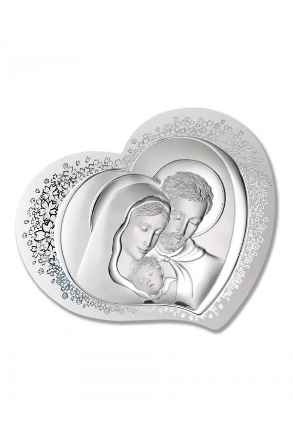 Srebrne pamiątki komunijne, na których zostały wygrawerowane lub wytłoczone wizerunki świętych to bardzo popularny upominek, którym obdarowuje się dzieci w dniu ich Pierwszej Komunii Świętej. Szczególnie lubiane przez dzieci są postacie aniołków oraz Święta Rodzina. Józef, Maria oraz mały Jezus symbolizują rodzinę, wiarę, nadzieję i ciepło domowe, dlatego ich wizerunek na obrazku jest bardzo ładną pamiątką przyjęcia swojego Sakramentu Pierwszej Komunii Świętej. Płaskorzeźba przestawiająca Świętą Rodzinę jest przedstawiona na prostokątnym obrazku, jak również w motywie serca, chmury czy roślin, co szczególnie podoba się dzieciom i przypomina o tym wyjątkowym dla nich dniu.